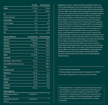 Generally safe for most adults, vegan-friendly, and free from gluten, dairy, and artificial additives. Minor cautions apply for those sensitive to caffeine (from green tea extract) or adaptogens (like ashwagandha). It’s well-tolerated, though some users may experience temporary bloating or digestive adjustment from probiotics and fibre. Contains vitamin K — so it’s unsuitable for people on certain blood-thinning medications.