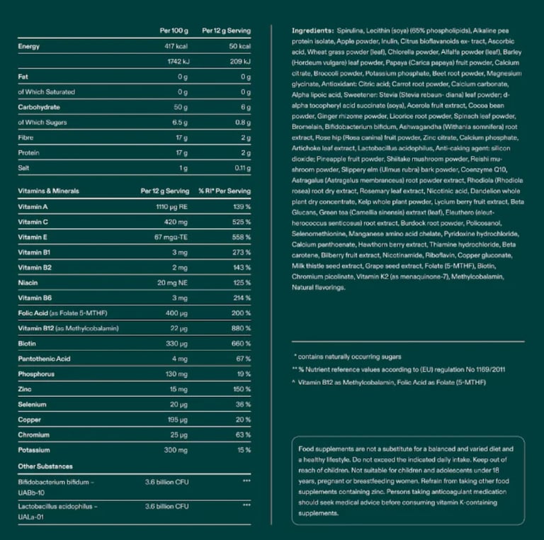 Key Actives: Spirulina, Chlorella, Ashwagandha, Probiotics, Vitamins A–K, Zinc, and Antioxidant Plant Extracts