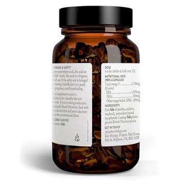 High-strength fish oil with a genuinely potent EPA+DHA dose per daily serving. The formula is minimal (fish oil + mixed tocopherols in fish-gelatin capsules) and free from flavours or sweeteners. Excellent for people who don’t eat oily fish regularly. Downsides: four capsules per day, fish allergen, and a premium price per serving.