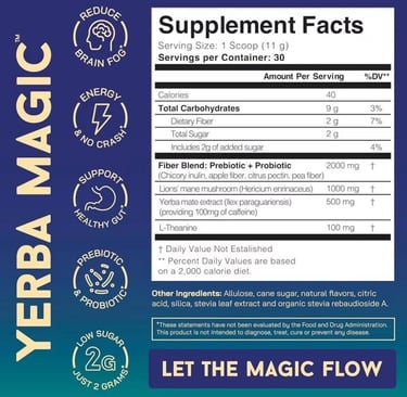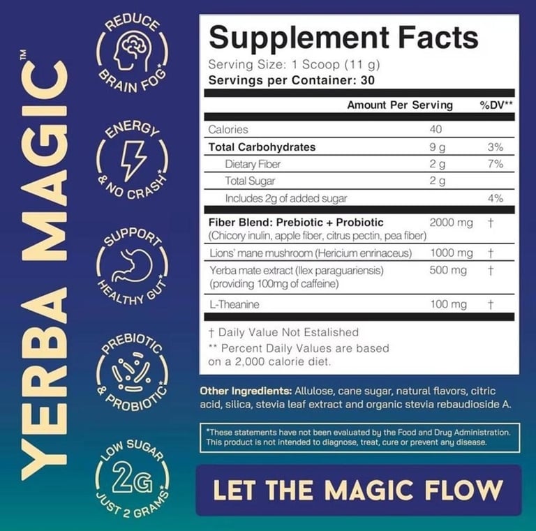 Key Actives: Yerba Mate Extract (500 mg), Lion’s Mane (1 g), L-Theanine (100 mg), Pre-/Probiotic Fibre Blend (2 g)