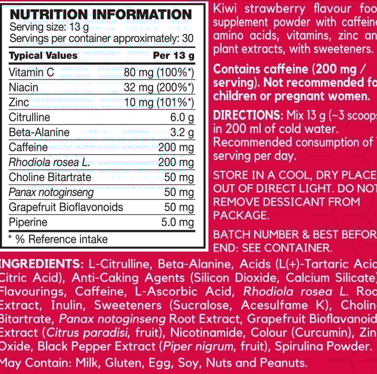 A classic, stim-forward pre-workout that hits the evidence-based marks for pump (6 g citrulline) and tingles (3.2 g beta-alanine), with 200 mg caffeine for alertness. It works—and the price is keen—but the label leans heavy on flavours, acids, anti-caking agents and artificial sweeteners.