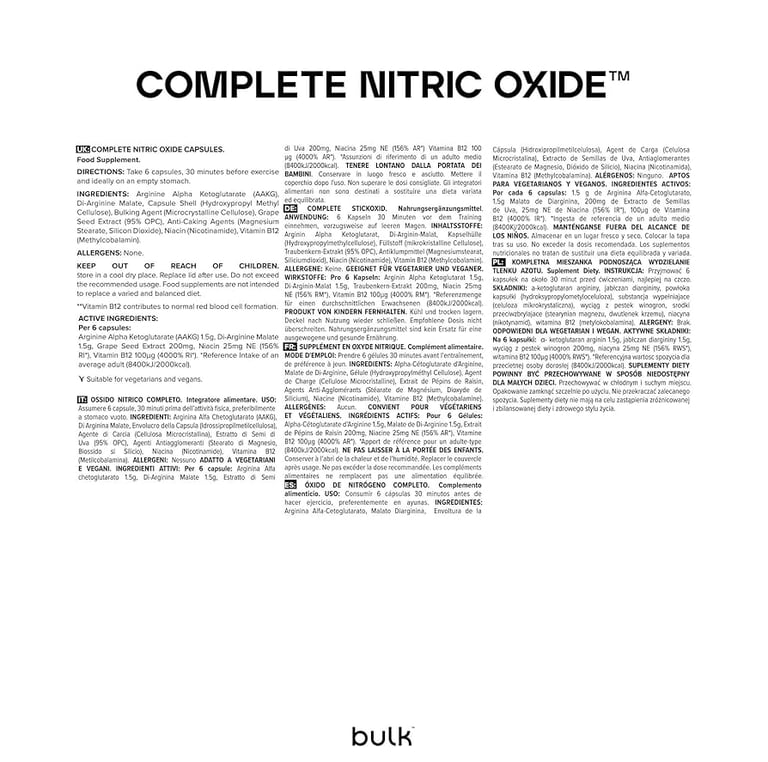 Cons: no citrulline or nitrates; heavy reliance on arginine salts; unnecessary add-ons (25 mg niacin and 1,000 µg B12) that don’t meaningfully aid NO production acutely; standard excipients (microcrystalline cellulose, magnesium stearate, silicon dioxide).