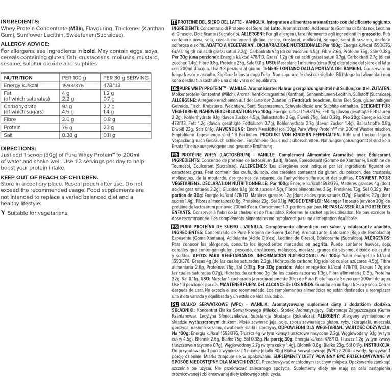 Free from gluten and suitable for vegetarians. Well-tolerated by most users with clear allergen labelling. Contains soy and dairy, as expected with whey protein. Produced under strict UK food standards with consistent batch quality.