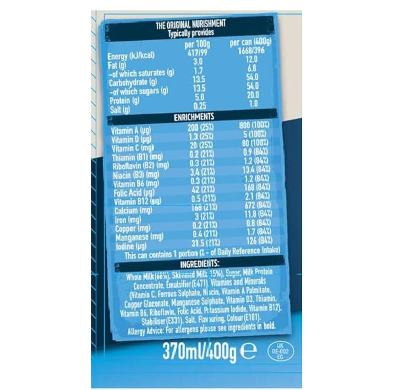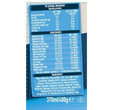 A nostalgic, calorie-dense canned shake built on whole/skimmed milk, sugar, and milk protein concentrate. It’s convenient and filling (≈398 kcal/can) with decent protein and broad vitamin/mineral fortification. The trade-offs: high added sugar (≈36 g/can), stabilisers/emulsifiers, and a less balanced macro profile than modern meal shakes. Good for quick calories; not our cleanest pick for everyday nutrition.