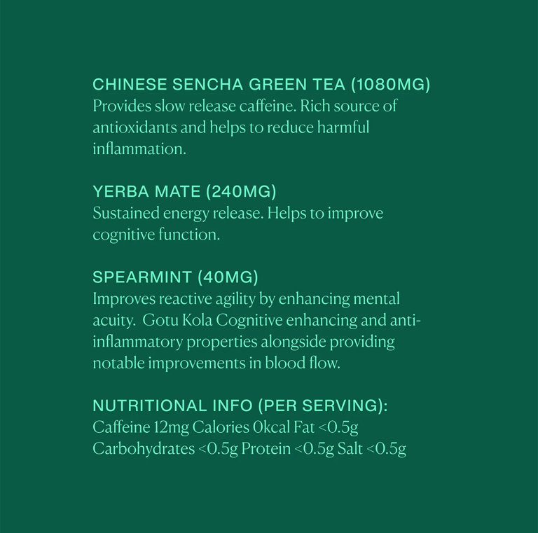 A clean, vegan-friendly ingredient list with nothing artificial — just a botanical blend of tea leaves, herbs, and fruit peel. However, there’s no transparency on standardisation levels (e.g., ginseng extract strength or caffeine content per serving), which limits accuracy for performance tracking. The addition of lemon peel and matcha adds flavour and antioxidants, but the formulation prioritises taste over clinical strength.