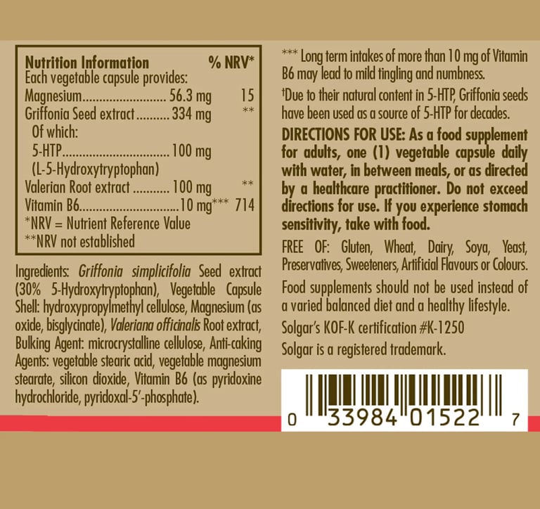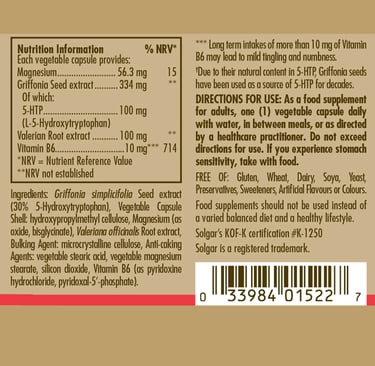 Key Actives: 5-HTP (from Griffonia Seed Extract – 100 mg), Valerian Root Extract (100 mg), Magnesium (56.3 mg), Vitamin B6 (10 mg)