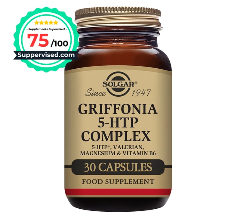 Solgar’s Griffonia 5-HTP Complex blends 5-HTP, Valerian root, Magnesium, and Vitamin B6 into a compact formula aimed at supporting serotonin balance, sleep quality, and relaxation. It’s designed for users seeking natural calm or relief from mild stress and sleep disruption. While the ingredient synergy is strong, the formula includes a few unnecessary additives, and long-term daily use at this dosage of Vitamin B6 may pose minor safety concerns.