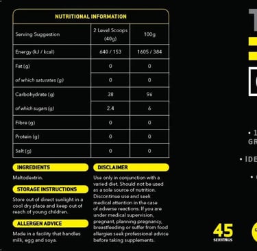 Single-ingredient panel (maltodextrin) keeps things simple and transparent. That said, it’s ultra-processed and very high GI. No added electrolytes or carb diversity, and no flavouring—great for purity, but limited flexibility.