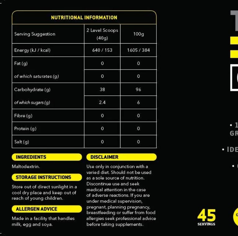 Key active: Maltodextrin (complex carbohydrate, high GI)